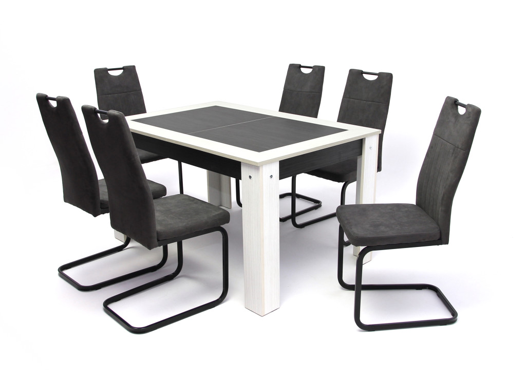 Alina asztal 135-ös Bianco/Nero + 6 db Torino szék Szürke szövet