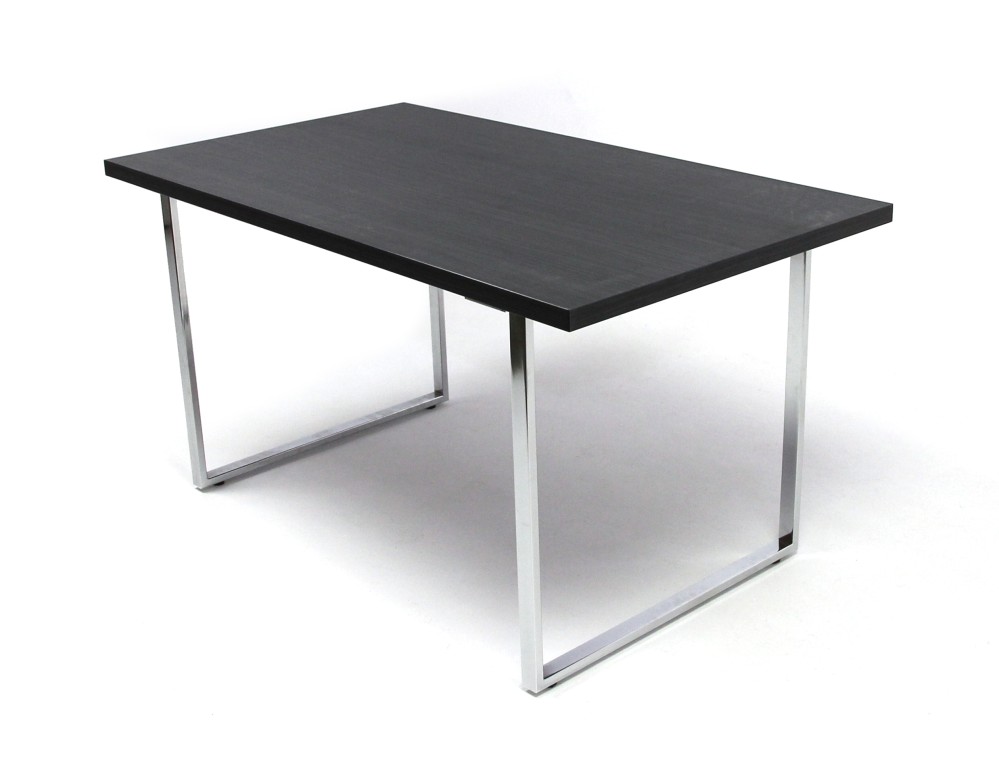 Laminált faforgácslapból készült asztallap duplungolt kivitellel, ABS élzárással és PU ragasztási technológiával, krómozott acél láb.
