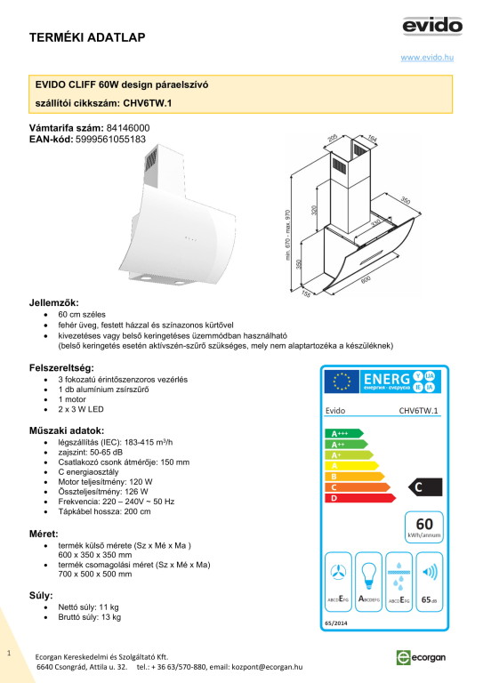 EV.CLIFF 60W 60 cm elszivó Fehér