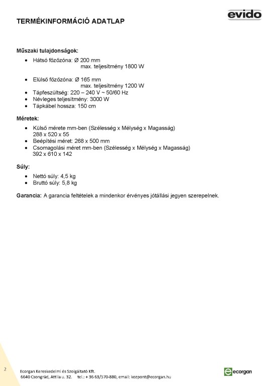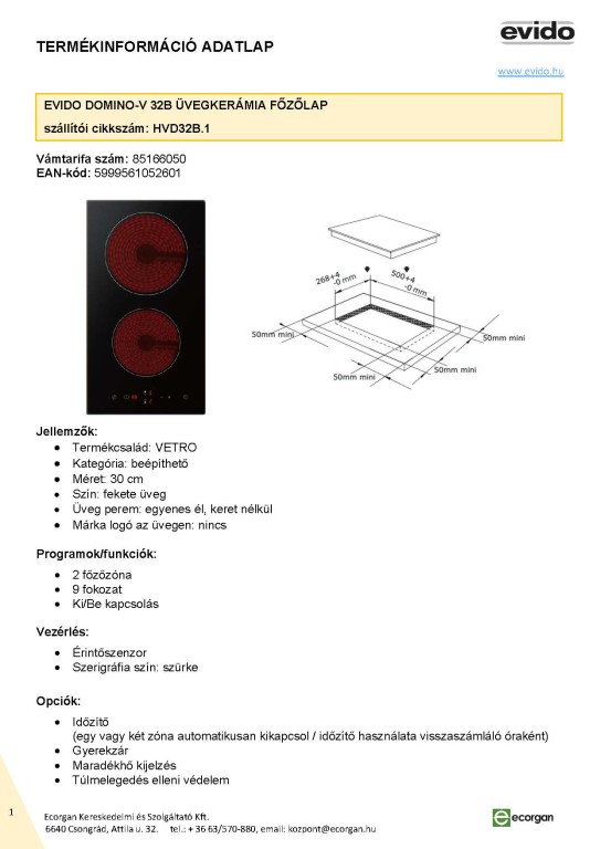 30 cm széles, érintőszenzoros vezérlés (9 fokozat) 2 zóna túlmelegedés elleni védelem, maradékhő kijelzés, időzítő, gyerekzár