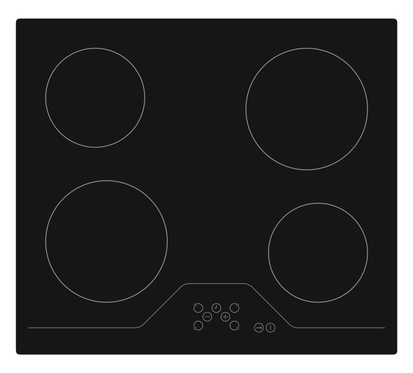 fekete, keret nélküli üvegkerámia felület, 60 cm széles, érintőszenzoros vezérlés (9 fokozat), 4 zóna Booster