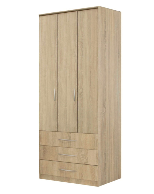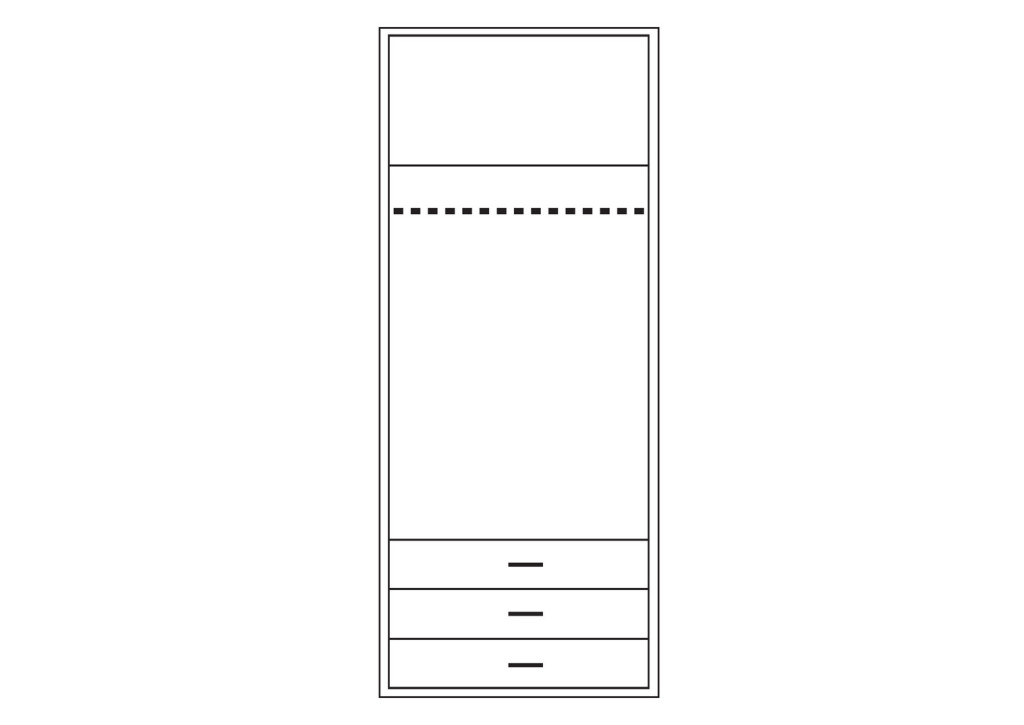 Gardróbszekrény 16 mm-es faforgácslapból, lapraszerelt kivitellel és fém fogantyúval.