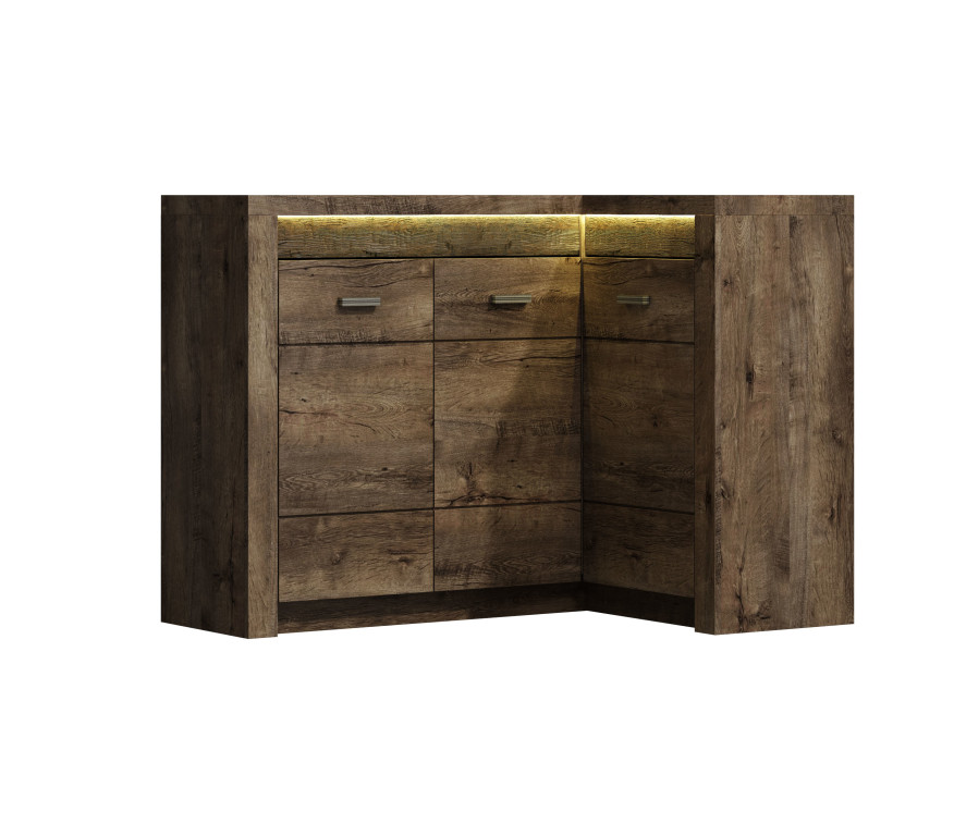 Lapraszerelt bútor, sarok komód. Méretek : 90x131x42x104 (led világítással) Bruttó súly : 70,1 kg Csomagolás : 1 db / 2 doboz