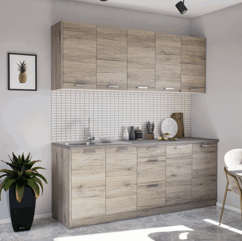 - az alábbi konyha elemekkel: F80-as 2db, F40-es 1db, AMO80-as 1db, AML80-as 1db, AF40-es 1db, Felső oldaltakaró 2db, Alsó oldaltakaró 2db, lábelő 200cm