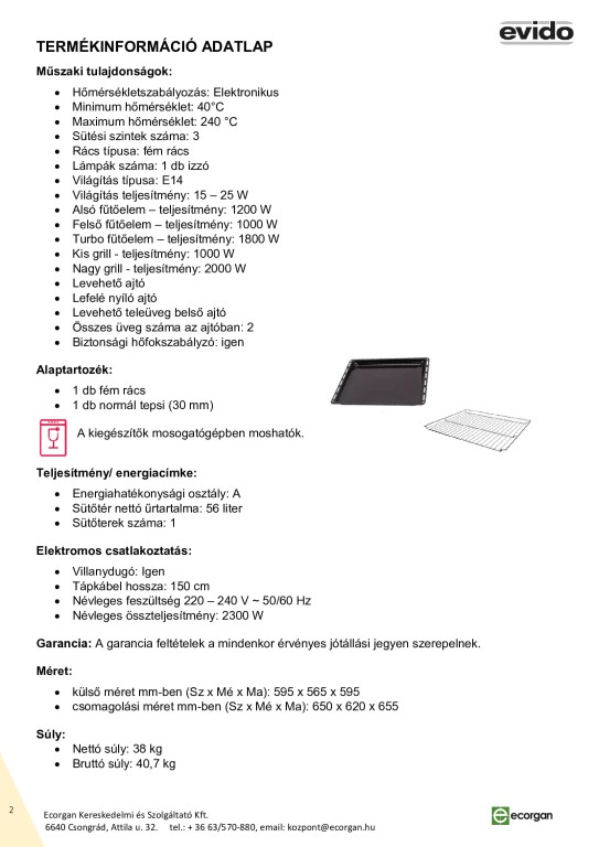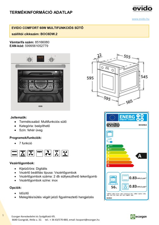 56 literes sütőtér, dupla üvegű ajtó, gőztisztítás,