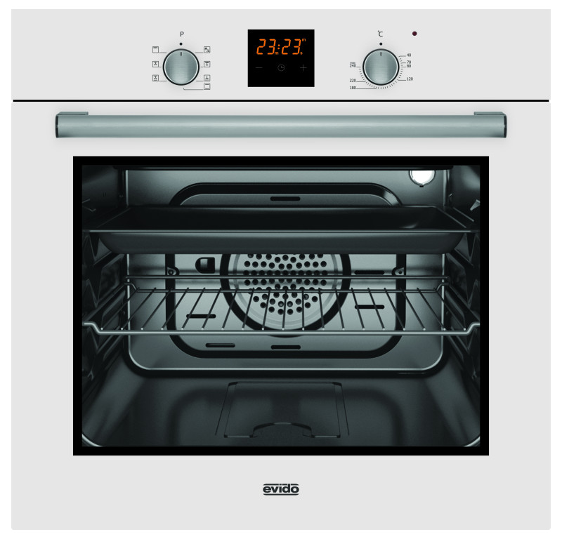 inox, fehér vagy fekete üveg front, 7 funkció, digitális kijelző, süllyeszthető vezérlőgombok, 40-240 °C,