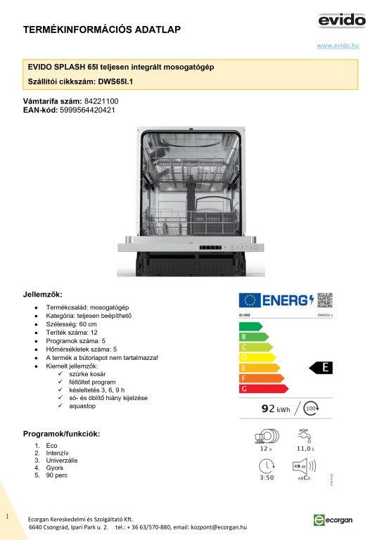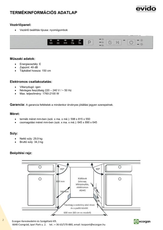 Ez az EVIDO mosogatógép szlogenjéhez hűen mindent tud, amit kell, és semmit, ami felesleges. Könnyű és gyors kezelhetőségének köszönhetően pillanatok alatt megtöltheti készülékét, melyet az Önnek megfelelő program kiválasztása után rögtön el is indíthat. Ergonómikus kosárkialakítása lehetővé teszi nagyobb méretű edények egyszerűbb elhelyezését. A rozsdamentes belső tér biztosítja a készülék hosszú élettartamát. Ezt az EVIDO beépíthető mosogatógépet úgy tervezték meg, hogy a mosókarok szóróereje révén a legmakacsabb szennyeződésekkel is elbír, anélkül, hogy az edényeket beáztatná vagy kézzel kellene súrolnia, így csökkentve a vízfelhasználást. A berendezés sótartállyal rendelkezik a víz lágyítása érdekében, mely megakadályozza a vízkő lerakódását. A termék bútorlapot nem tartalmaz.