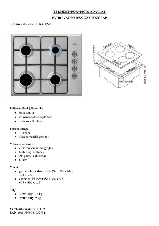 szálcsiszolt inox felület, 60 cm, 4 gázégő, elektronikus