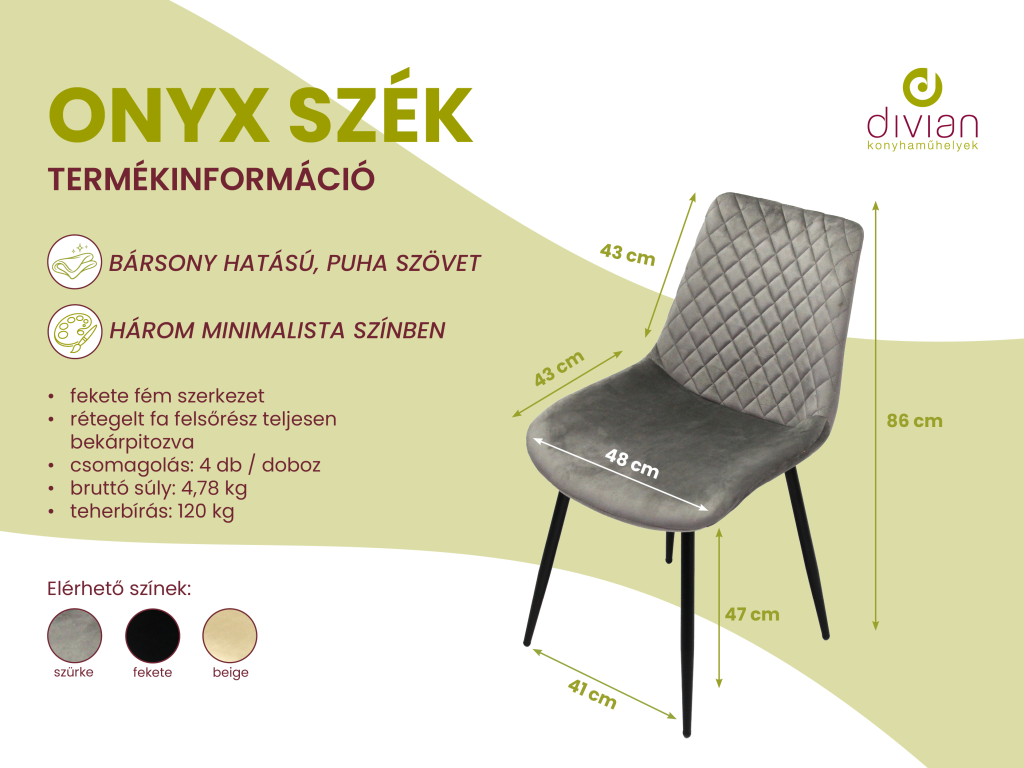 Méret: 85 x 48 x 47 x 43 cm (magasság x ülőfelület szélesség x ülőfelület magasság x ülőfelület mélység)
