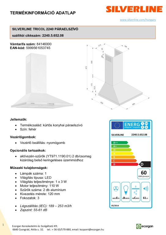 SILV.TRICOL 2240 50 cm elszívó Fehér