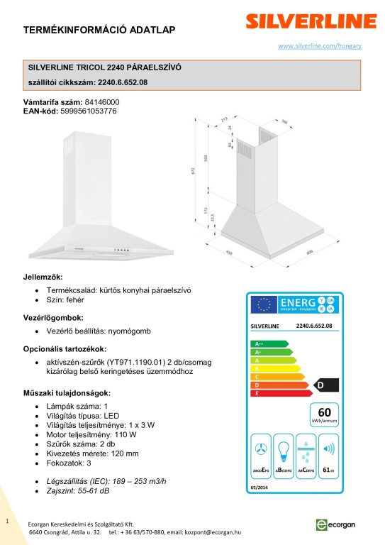 fali kürtős páraelszívó, inox, fekete vagy fehér színben, 3 fokozatú nyomógombos vezérlés, fém zsírszűrő, 1x28 W halogén világítás, légszállítás (IEC): 219-320 m3/h, zajszint: 55-63 dB, csatlakozócsonk Ø120 mm, D energiaosztály