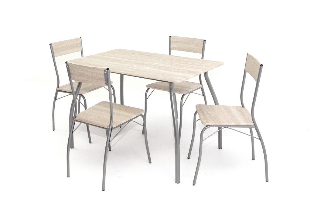 Festett fémvázas kivitel. Az asztallap és a székek ülőlapja/támlája fóliázott MDF lap. Összeszerelést igényel.