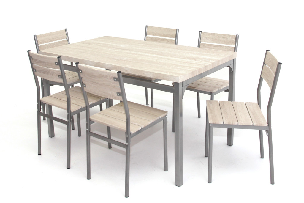 Festett fémvázas kivitel. Az asztallap és a székek ülőlapja/támlája fóliázott MDF lap. Összeszerelést igényel.