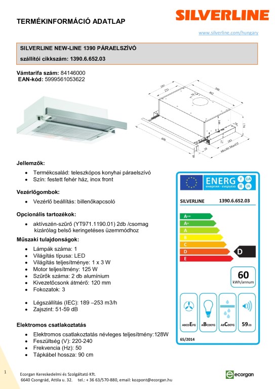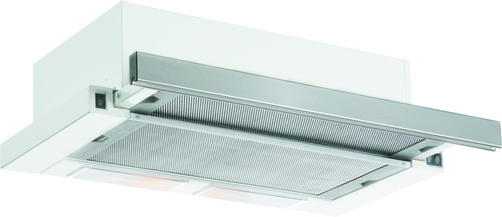 teleszkópos kihúzható páraelszívó, 50 vagy 60 cm széles, fehér festett ház, inox front, 3 fokozatú billenőkapcsoló, fém zsírszűrő, 1 motor, légszállítás (IEC): 206-239 m3/h, zajszint: 57-61 dB, csatlakozócsonk Ø150/120 mm, D energiaosztály