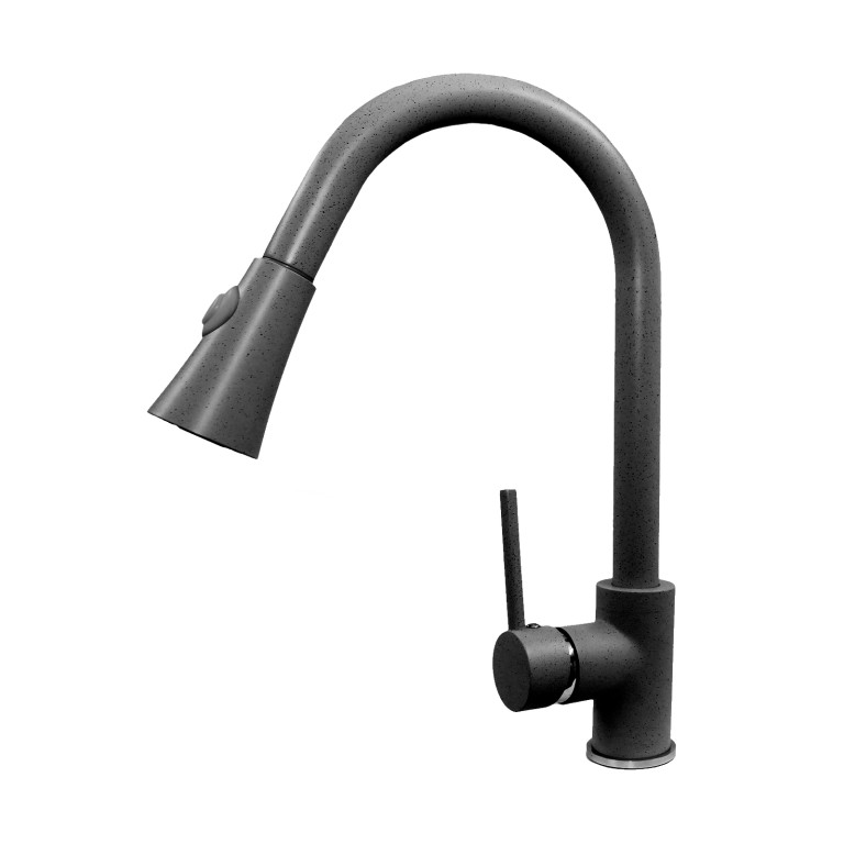 A Snake gránit zuhanyfejes csaptelep fekete modern formájával és praktikus funkcióival emeli konyhád színvonalát. A gránit bevonat tartósságot biztosít, a kihúzható zuhanyfej pedig megkönnyíti a mosogatást és a nagyobb edények öblítését. Elegáns fekete színe karakteres, mégis letisztult megjelenést kölcsönöz.