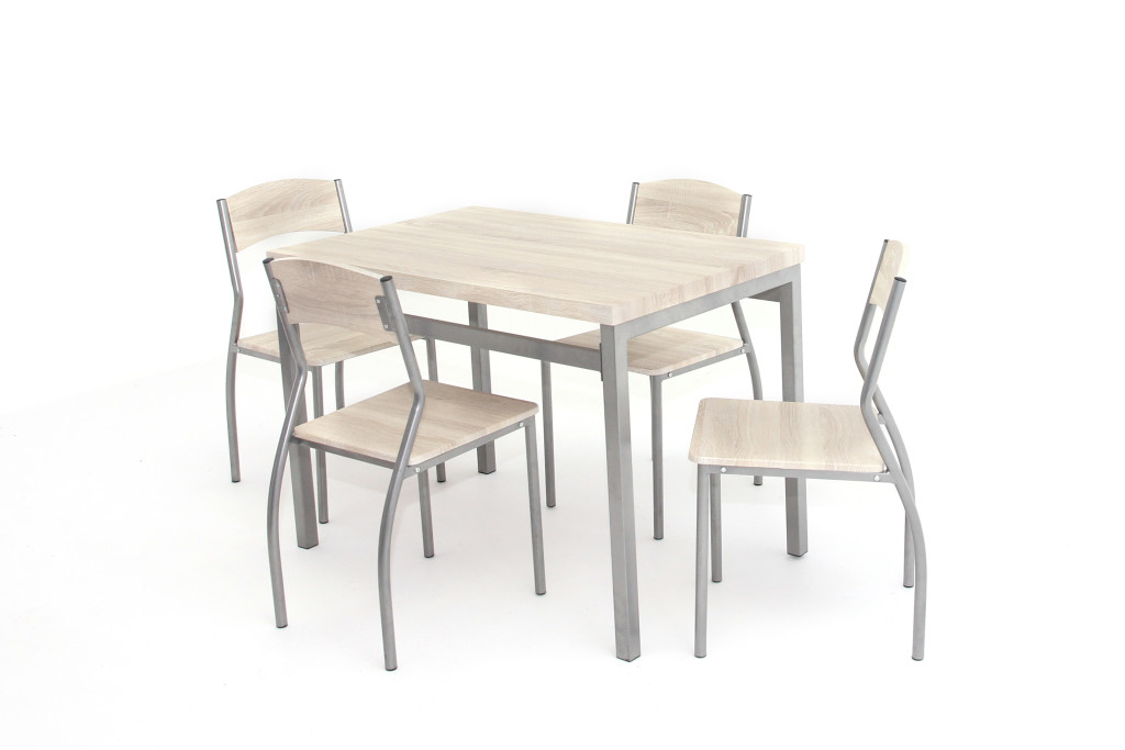 Festett fémvázas kivitel. Az asztallap és a székek ülőlapja/támlája fóliázott MDF lap. Összeszerelést igényel.
